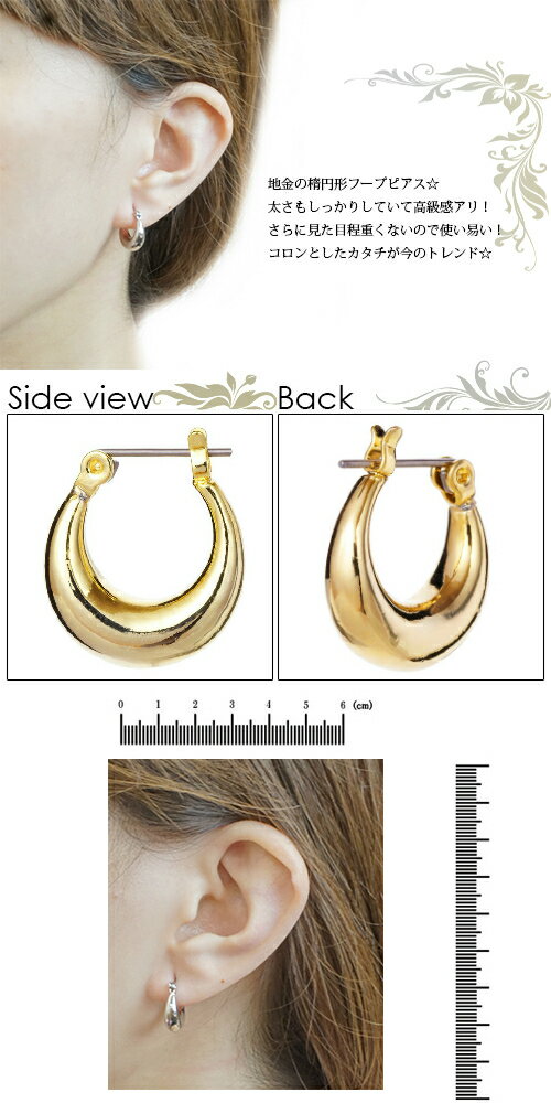 ギフト対応 素材 真鍮製(プラチナ ロジウム ゴールドコーティング) ニッケルフリー チタン製ポスト サイズ 幅:2〜5mm ポスト:太さ0.6mm 長さ10.5mm 直径:約13mm 地金の楕円形フープピアス 太さもしっかりしていて高級感があります。