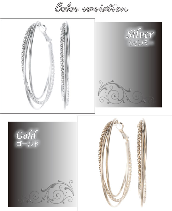 ギフト対応 素材: 真鍮製 ニッケルフリー プラチナロジウム/ゴールド/コーティング フープピアス チタン製ポスト サイズ: 全長:約縦53mm×横50mm×厚み1.5mm ポスト太さ/長さ:0.8mm/10mm 3つのフープがエレガントな印象に魅せてくれるフープピアス。