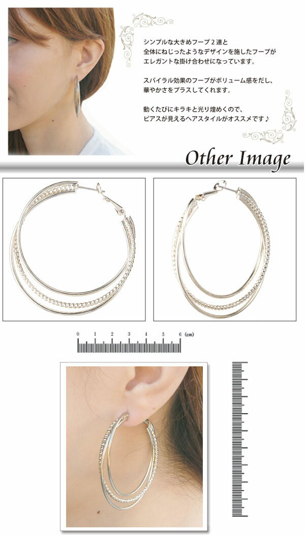 シンプルな大きめフープ2連と 全体にねじったようなデザインを施したフープが エレガントな掛け合わせになっています。