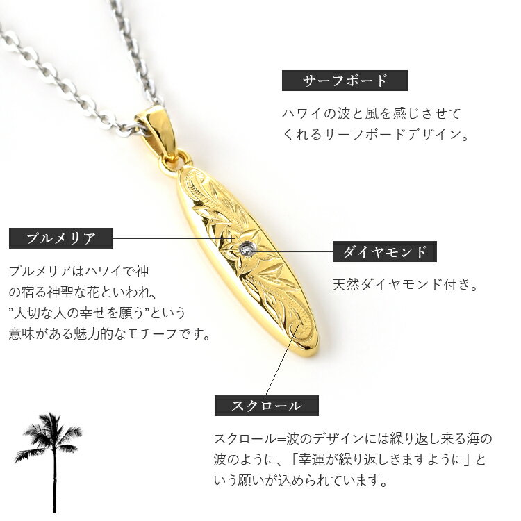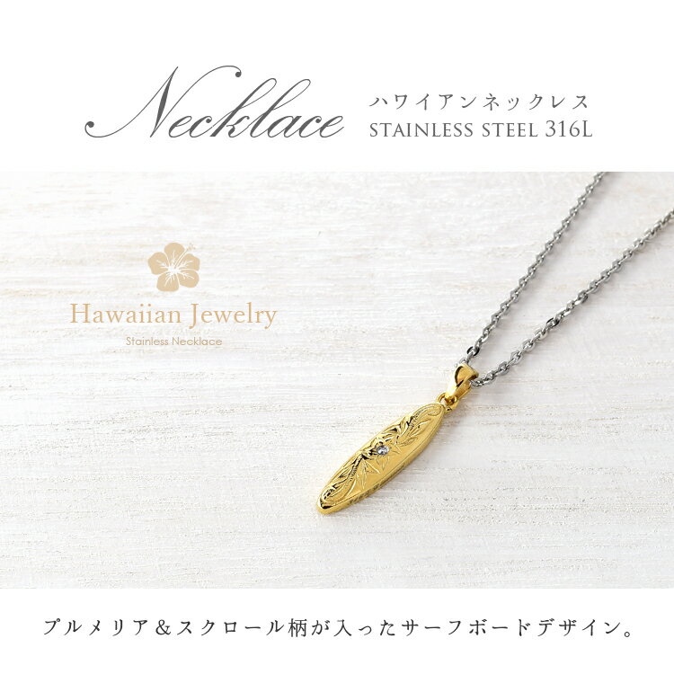 ギフト対応 ハワイアン ネックレス ステンレス316L【刻印無料】プルメリア&スクロール柄サーフボードデザイン♪